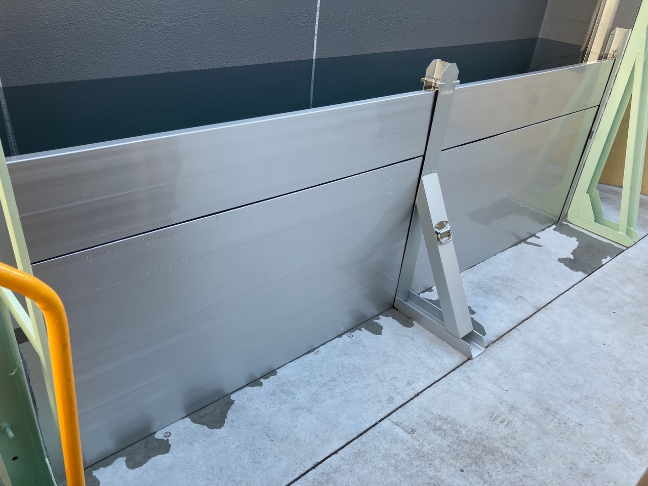 工場の大扉に設置した止水板で水張り試験をした事例です。土嚢の1/100程度の漏水量で抑えられていますが、支柱のコーキングや床面の状態が悪いこともあり、漏水量は比較的多くなりました。